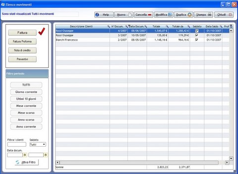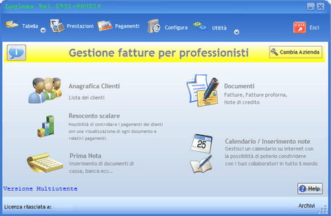 Software fatturazione professionisti, semplice programma che ti consente la creazione e la stampa di fatture per professionisti in maniera veramente immediata e semplice. E' possibile controllare le fatture emesse con dei semplici clic del mouse è altrettanto semplice controllare il fatturato dei clienti. E' prevista anche la stampa delle fatture pro-forma dei preventivi e delle note di credito.