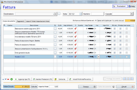 Inserisci le prestazione da fatturare