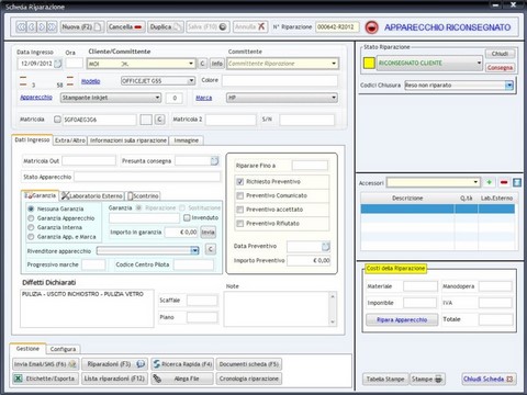 La procedura permette la gestione completa delle riparazioni di qualunque tipo, nelle schede di riparazione viene inserita la data d'ingresso dell'apparecchio, il nome del cliente, la marca il modello ecc. L'accettazione di un un apparecchio è molto semplice e veloce, al termine puoi stampare la nota di servizio in un foglio formato A4 con una copia per il tuo centro e una per il cliente.