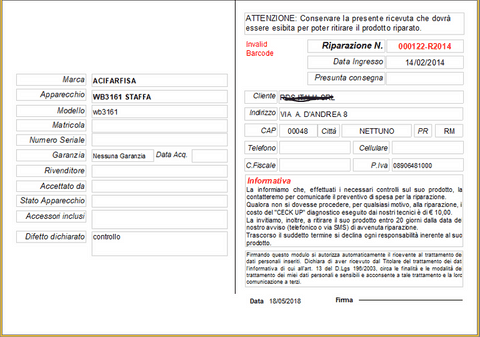 Puoi segnare lo stato ingresso dell'apparecchio per evidenziare se ha segni di usura graffi ecc.. Se l'apparecchio viene portato da un altro negozio o da aziende possibilmente hanno un codice che puoi inserire nella scheda e cercare al momento opportuno.